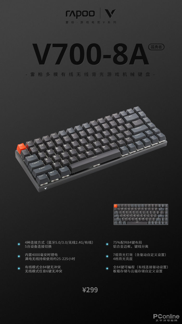 领军国产外设品牌,实力大厂上市企业Rapoo雷柏发布的V700-8A多模式有线无线背光游戏机械键盘。拥有机甲紫,孤勇者,无人区三款配色,75%配列84键的紧凑型键位布局,蓝牙5.0、蓝牙3.0、无线2.4G和有线四种模式,最多支持5台设备连接切换,雷柏自主黑青茶红游戏轴体,实现有线全键无冲,无线任意6键无冲,内置4000mAh的锂电池,支持边充边使用,全键可编程,超强的驱动软件也让键盘的可玩性获得更大的提高,售价仅为299元,相信它一定会成为你首选的游戏利器,给你畅快的游戏操作体验。
