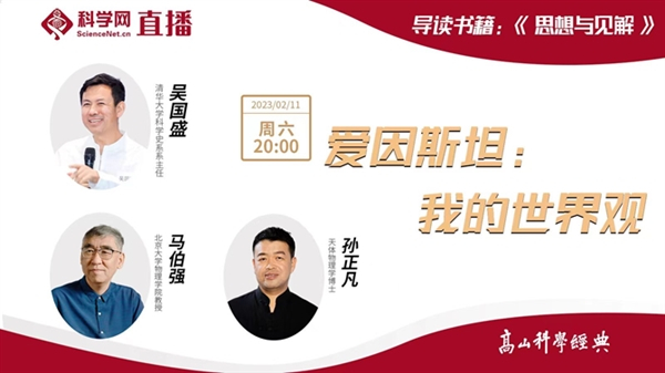 2023年2月11日,本周六晚八点,清华大学科学史系系主任、清华大学科学博物馆馆长吴国盛;北京大学物理学院教授马伯强;科普作家、天体物理学博士孙正凡,一起阅读《思想与见解》,认识真实的爱因斯坦,与其伟大的灵魂进行深度对话。