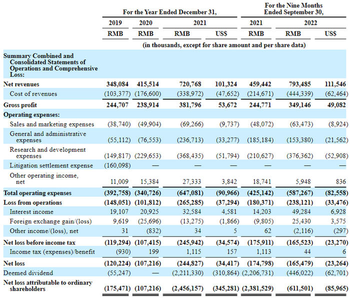这一只独角兽仍然处于亏损。对此,禾赛科技曾在科创板招股书中坦言,是由持续研发投入过高所致。招股书披露,2019年至2022年前三季度,禾赛科技的研发费用分别为1.50亿元、2.30亿元、3.68亿元和3.76亿元,分别占同期净收入的43.0%、55.3%、51.1%和47.4%。