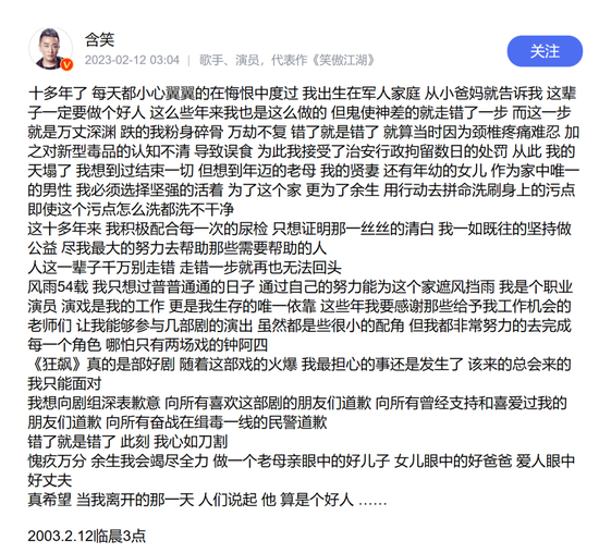 12日凌晨,被指《狂飙》剧组曾涉毒的演员含笑发微博表示,向剧组深表歉意,向所有喜欢这部剧的朋友们道歉,向所有曾经支持和喜爱过他的朋友们道歉,向所有奋战在缉毒一线的民警道歉,承认自己过去犯的错,并表示余生会做个好儿子、好爸爸、好丈夫。