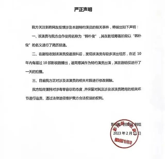 2月11日晚,《狂飙》剧组官博就此事发布声明:该演员与剧组合作使用名称为“韩朴俊”,其在剧组筹备阶段以“韩朴俊”的名义投递简历。在剧组收到该演员投递资料后,发现该演员有较多演出经历,在近10年内有超过10部影视剧播出,遂同意其作为特约演员出演,其在剧组仅进行了一天的拍摄。目前剧组正修改删除涉及该演员的相关片段。