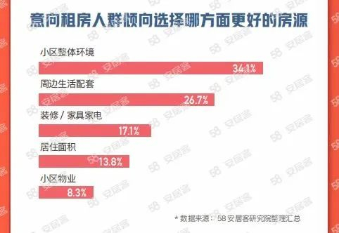 如今,租房住的年轻人越来越多,租住环境对他们的生活幸福感有着重要影响。报告显示,在预算有限的情况下,有34.1%的意向租房人群更希望选择小区整体环境更好的房源;有26.7%的意向租房人群更注重周边生活配套,17.1%的人群希望租住房源中能有更好的装修/家具家电,13.8%的意向租房人群希望拥有更大的居住面积。不同居住成员来看,没有小孩的单身独居租客及两人家庭,租房时相对更注重小区整体环境及房间内部装修家具家电等,对居住生活品质要求较高;而有小孩的家庭则更侧重居住实用性,对于小区环境、周边配套及居住面积有一定要求。