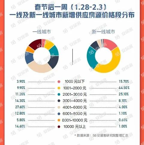 从不同户型的租房供应来看,春节后一周(1.28-2.3)一线城市及新一线城市的租房供应中一居室占比超过40%,一线城市二居室供应量占比35.5%,三居室占比16.4%,对比调研中租客的需求来看,单身租客及无孩家庭的租房需求基本可以满足。月租金价格段方面,春节后一周(1.28-2.3)一线城市租房供应中4001-6000元的房源占比27.6%,2001-4000元的房源占比25.5%;新一线城市中,1001-2000元的房源占比最多,为44.5%,2001-3000元的房源占比25.1%。