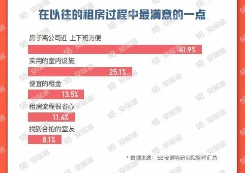 但在租房的过程中,也有很多令人满意的体验。41.9%的人表示在租房时找到了离公司近的房源,上下班很方便;有25.1%的人在租房时最满意房子的室内设施。13.5%的人表示租到了划算的房子,租金较为便宜;也有人觉得“租房流程很省心”,调研数据显示,选择此项的租客中有65.8%的人选择通过专业线上找房平台找房租房,省心的租房流程带来了良好的租房体验;还有人觉得合租虽然牺牲了一部分居住空间,但找到了合拍的室友,也是租房时带来的不错的收获。