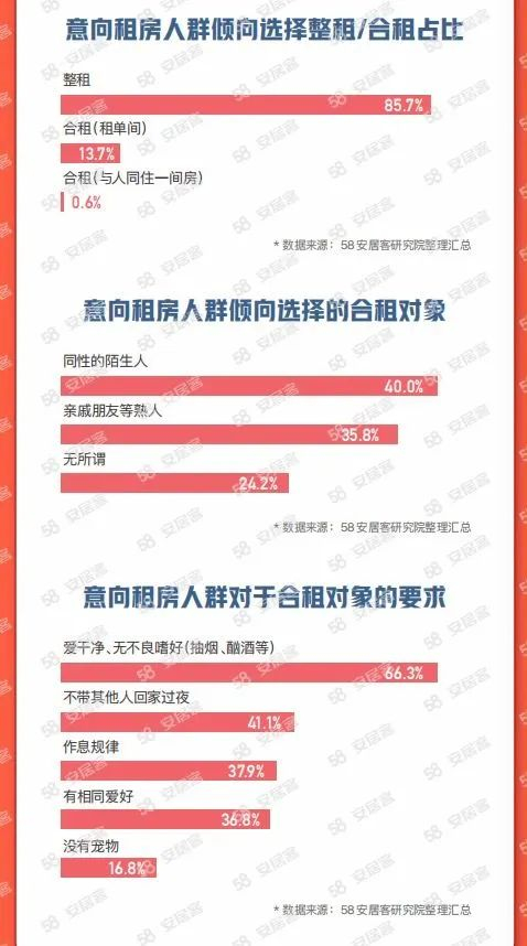 伴随着租房需求层级的不断增加,向往品质独居的租房人群越来越多,新一代年轻租客也更渴望实现“整租自由”。在本次调研中,有85.7%的意向租房人群选择整租一套房,选择合租的人群占比仅14.3%。单身独居人群中,选择合租的占比为40.7%。在选择合租的人群中,他们选择合租对象时不仅仅把目光局限在亲戚朋友等熟人上,选择和同性的陌生人合租一套房的占比40.0%。对于合租对象的要求,多数人希望合租室友无不良嗜好、爱干净,且不要带其他人回家过夜。