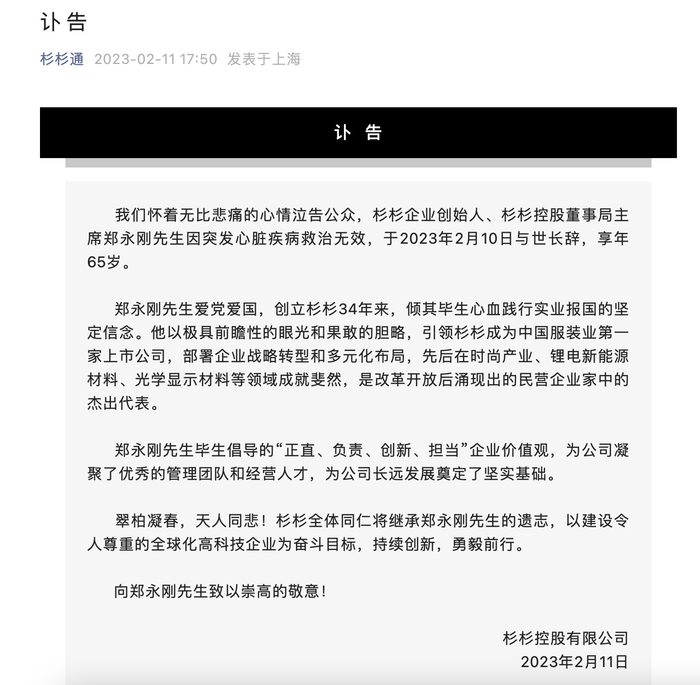 2月11日17时50分,杉杉控股在官方微信公众号发布讣告,郑永刚因突发心脏疾病救治无效,于2023年2月10日与世长辞,享年65岁。