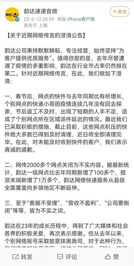 针对派件异常等情况,韵达2月12日晚发布《关于近期网络传言的澄清公告》称,春节后,网点的快件与去年同期比有所增长,个别网点的快递小哥因疫情连续几年没有回去探亲,节后返工不及时,出现了短期的人手不足,造成了个别网点所在区域派件延迟的情况。