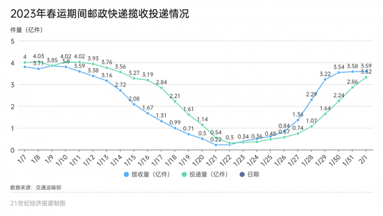 值得注意的是,根据国务院物流保通保畅工作领导小组办公室监测汇总数据显示,2月1日,全国快递日均揽收投递均恢复至3亿件以上,邮政快递揽收量约3.59亿件,环比增长0.3%;投递量约3.32亿件,环比增长16.1%。