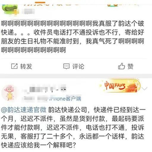 有用户在社交平台发消息称,韵达快件已经到达一个月,迟迟不派件,电话也打不通,投诉无果;还有用户发消息称,韵达最近的快件不是丢件,就是没物流信息,还有不发件的。