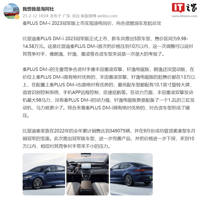 对此,比亚迪汽车品牌及公关事业部副总经理杜国忠在社交媒体表示,秦 PLUS DM-i 2023 冠军版上市实现油电同价,向合资燃油车发起总攻,“这是比亚迪秦 PLUS DM-i 首次把价格压到 10 万以内,这一次调整可以说对其竞争对手,像朗逸、轩逸、雷凌等合资车型来说是一次很大的考验了。”