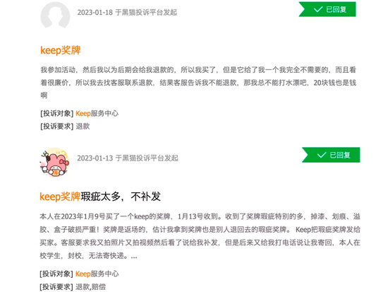 奖牌虽疯狂,但它也存在自己的界限。在黑猫投诉上,Keep奖牌存在着另一面——质量不稳定、发货慢、参与规则不明晰等。
