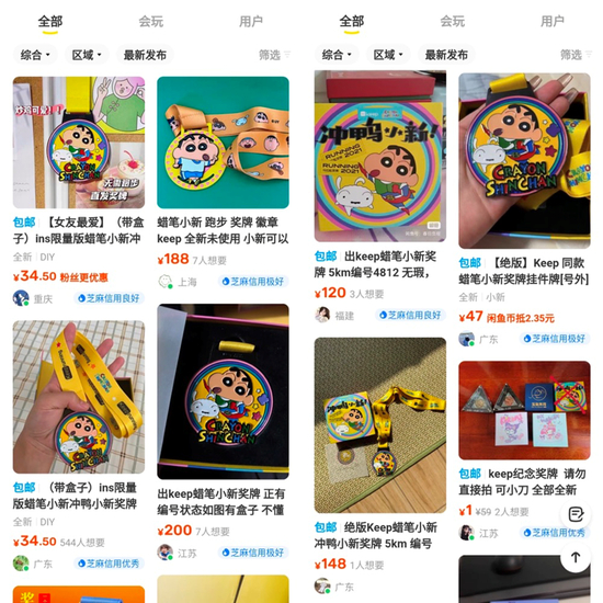 比如,联名蜡笔小新IP设计的Keep奖牌,由于已经绝版,在闲鱼上被开出了200元的高价。甚至还出现了鉴别该奖牌是正版还是盗版的帖文。