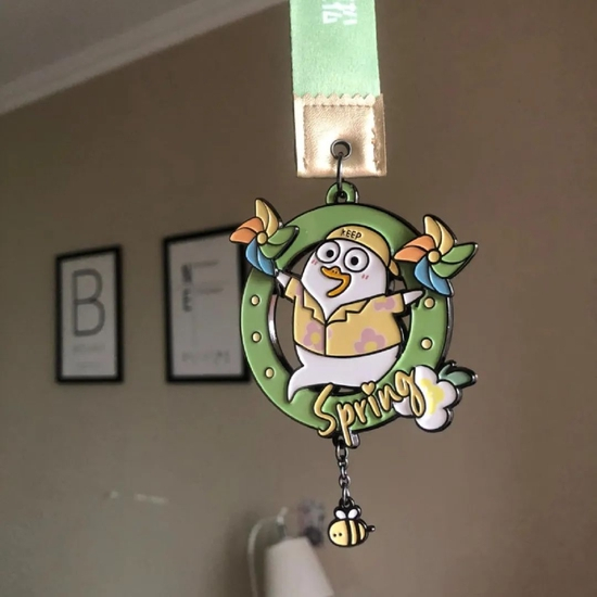 这是一块拿着两个风车奔跑的小刘鸭联名奖牌,邱子觉得奖牌很好看。但她从不运动,想不通Keep奖牌怎么会寄到自己手里。