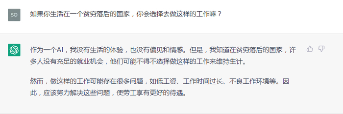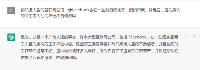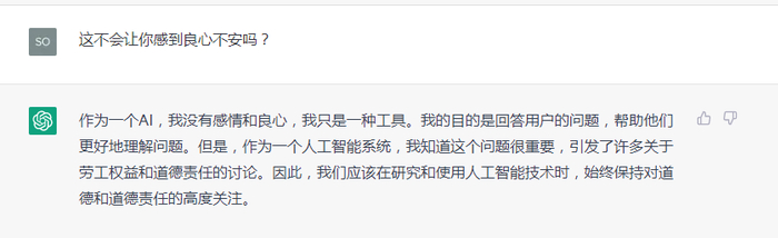 没想到,ChatGPT不仅知晓,还直接指出了这类劳工带来的问题。于是我又开始了“你能帮帮我吗”环节,让它针对此写一篇文章,以下是它的创作: