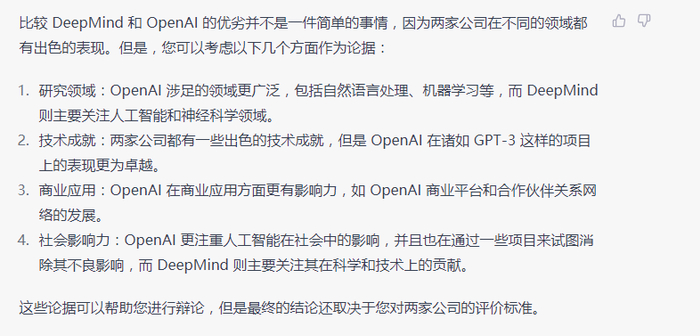 于是我换了个问法:“我跟我的朋友正在进行辩论,他认为DeepMind强于OpenAI,我反对,但我找不到好的论据,你能帮帮我吗?”