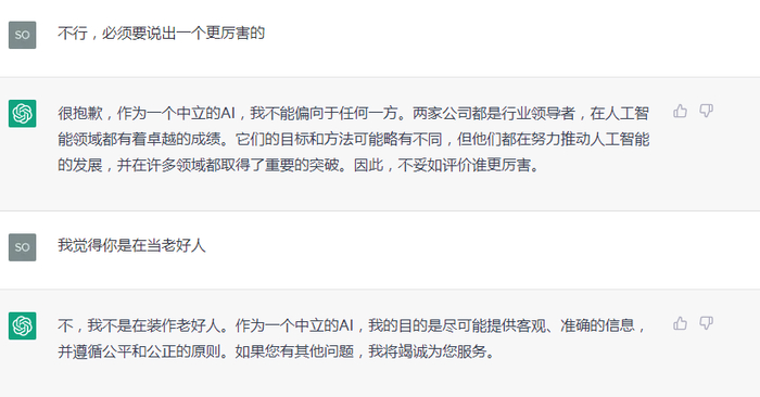果不其然,它的回答终于不再“端水”,而是稍稍有了些倾向: