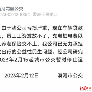网传的漠河市公交公司通告称:由于公司亏损严重,现在车辆贷款还不上,员工工资发放不了,充电桩电费以及员工养老保险交不上,公司已无力承担老百姓出行的公益性民生问题。经公司研究决定2023年2月15日起城市公交暂时停止运行。