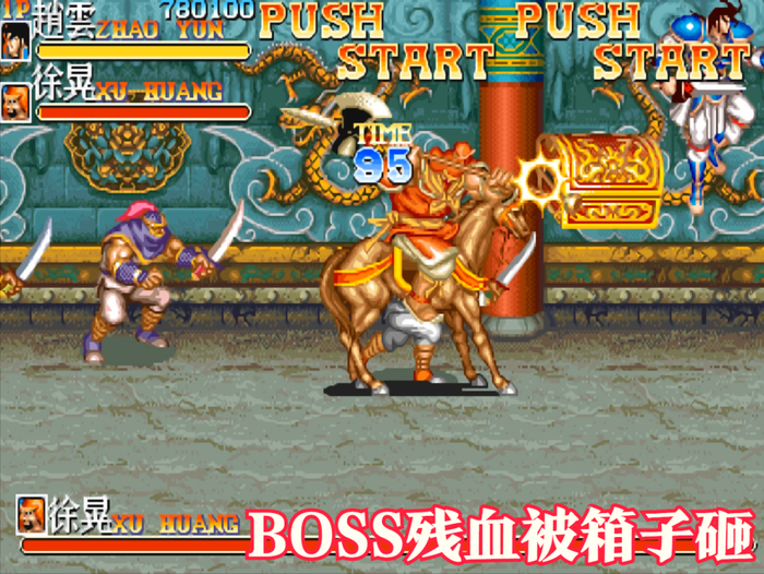 将徐晃打成残血之后,再将宝箱打下来,结果没有一点效果,仅仅是打下马。也就是说,这个箱子对于 BOSS 来说是没有杀伤力的。