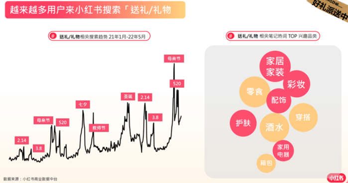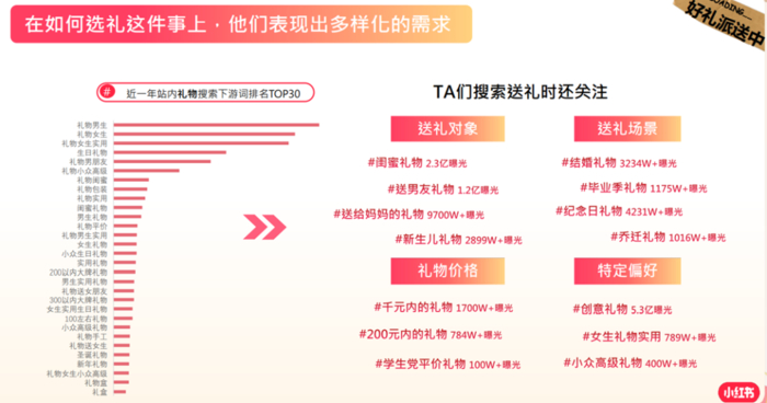 微观上,小红书的节日营销有超乎强大的粘性,越来越多用户搜索[送礼],将礼物作为情绪价值传递的媒介。