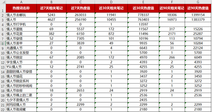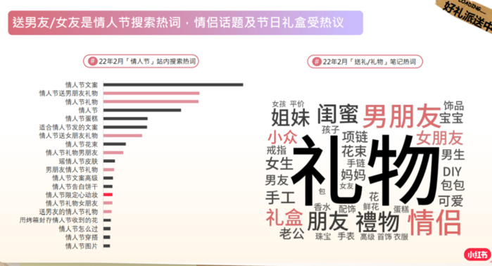 通过以上的小红书的相关数据参考,会发现热搜词中“情人节礼物、情人节送男朋友礼物、情人节送女朋友礼物、情人节穿搭和情人节礼物”等关键词热度比较高。