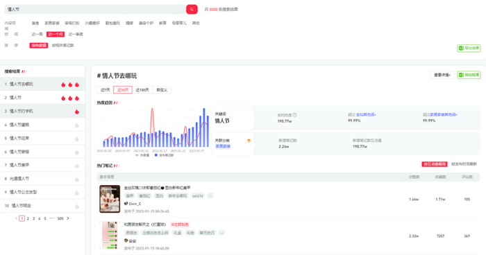 再看今年的情人节营销,1月份新增笔记2.24W,1月初开始便有笔记的陆续发布,呈上升的趋势,在春节期间有回退,毕竟不管是博主还是用户,都忙着过年放松,创作数量和热度会有所下降。
