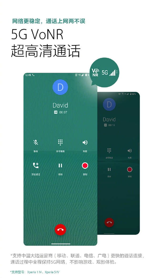 支持中国大陆运营商(移动,联通,电信,广电)5G VoNR通话