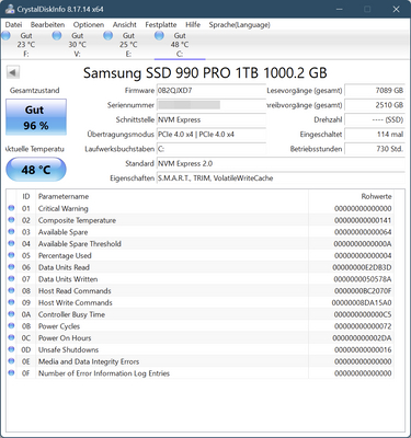 在这之前,这样一款旗舰级SSD最近却爆出了寿命门事故,有人买了2TB容量的990 Pro之后,使用没几天,健康度就大幅下滑,SMART监控信息中显示跌倒了99%,随后一路下滑到98%、95%,直至94%。