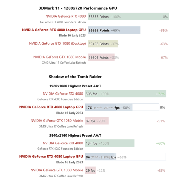 近期,有人对比了RTX 4080移动版和RTX 4080桌面的性能,发现前者相较后者在性能方面要落后35%左右。