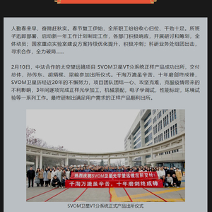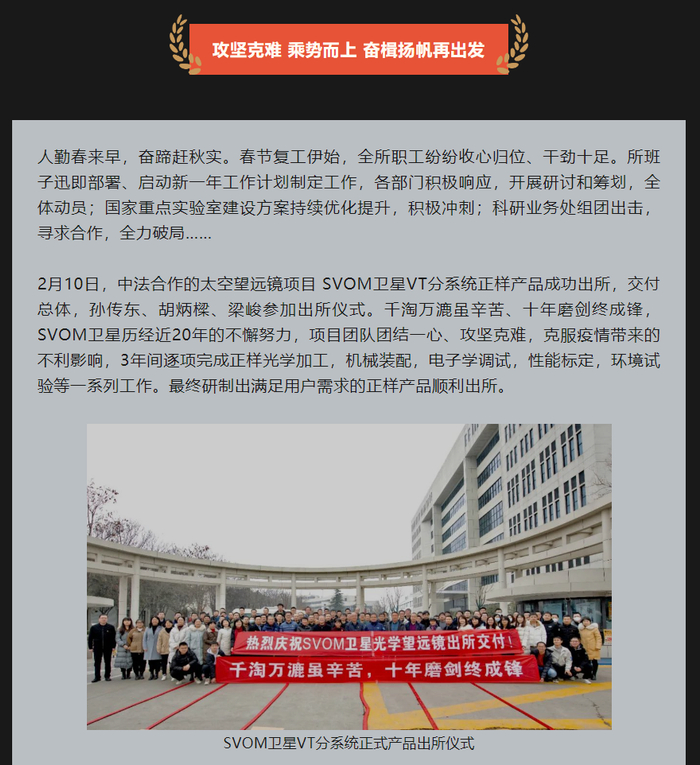 据介绍,SVOM 卫星历经近 20 年的不懈努力,3 年间逐项完成正样光学加工,机械装配,电子学调试,性能标定,环境试验等一系列工作,最终研制出满足用户需求的正样产品顺利出所。
