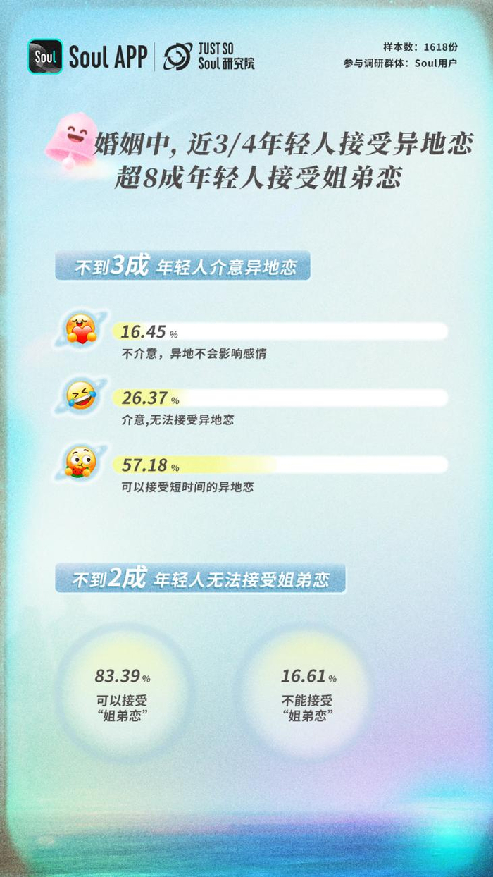 年轻人的开放还体现在择偶渠道和择偶形式上的变化。为找寻真爱,年轻人积极开拓线下活动,社交应用等渠道,9.36%年轻人接纳传统相亲形式。在Just So Soul研究院的调研报告中,婚姻中,姐弟恋接受程度高达80%以上,异地恋接受程度高达70%以上。