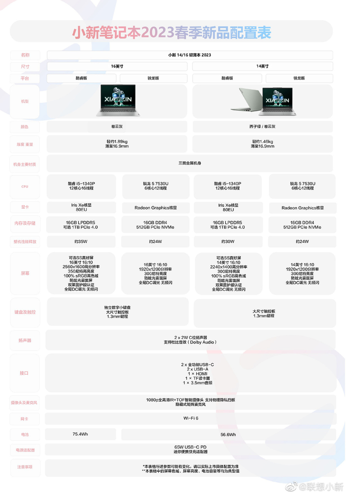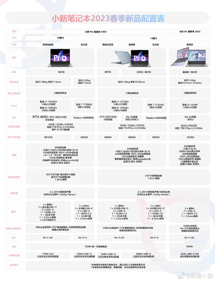 联想小新笔记本 2023 春季新品全系配置公布,三大系列各有所长