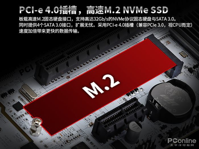 板载全速PCIe3.0X4M.2固态硬盘接口,支持高达32Gb/s的NVMe协议固态硬盘与SATA3.0。同时提供4个SATA3.0接口,扩展无忧。采用PCIe4.0x16插槽(兼容PCIe3.0,视CPU而定),速度加倍,为显卡提供了更快的数据传输。