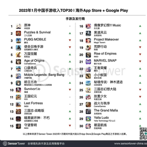 今天,数据统计机构Sensor Tower发布最新数据, 展示了2023年1月国产手游在海外市场取得的收入情况。