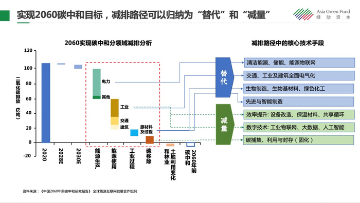 宏观上看,从2020年中国宣布双碳目标,到2060年实现碳中和,减排路径可以归纳为“替代”和“减量”。“替代”主要是指生产端的能源清洁化、工业电气化等,需要新的技术、手段和过程去替代,“减量”主要是指通过数字手段,包括工业互联网、大数据人工智能等等,提高各个环节的运营效率。