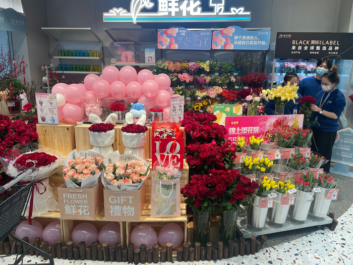 成都盒马来福士店,各种时令鲜花和玫瑰陈列丰富