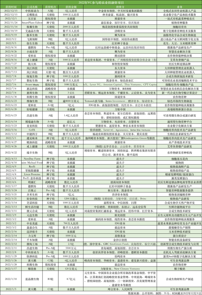 高瓴创投2022年密切关注农业碳中和,推出了40亿碳中和新基金,一共参与到了农业领域里的3个项目、4起投融资事件,参与投资项目包含合成生物材料生产制造商蓝晶微生物,可食用微生物合成蛋白研发商昌进生物,农作物智能种植决策服务提供商爱科农。