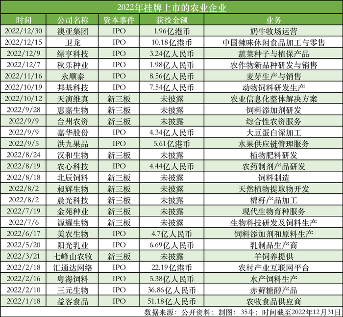 2022年,共有25家农业企业挂牌上市,其中农牧食品供应企业益客食品公开发行募集资金最多,为51.18亿元,其次是赤藓糖醇产品研发商三元生物,募集资金36.86亿元。