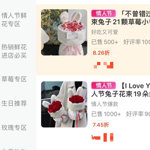 除热门的红玫瑰外,消费者的喜好开始涌现新变化,像粉荔枝玫瑰、卡布奇诺玫瑰等具有个性色彩的鲜花越来越受到大众喜爱。此外,新奇特的混搭花束十分受年轻情侣的追捧,比如结合兔年元素的兔子花束成为今年的热门款,该平台“兔子花束”的搜索量环比上周增长564%,已有商家的团购销量超过500单。