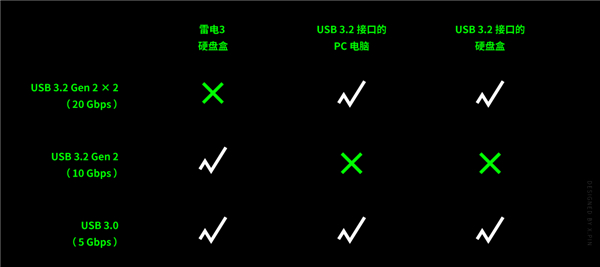举个栗子,一些雷电 3 硬盘盒,如果连接的电脑不支持 40Gbps 的雷电 3 ,它往往会直接落到 USB 5Gbps 上,速度远不如价格便宜得多的 USB 20Gbps 硬盘盒。