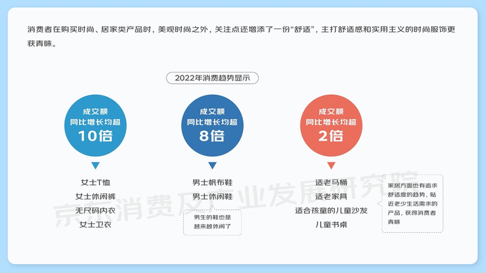 消费者在购买时尚、居家类产品时,美观时尚之外,关注点还增添了一份“舒适”,主打舒适感和实用主义的时尚服饰更获青睐。2022年消费趋势显示,女士T恤、女士休闲裤、无尺码内衣、女士卫衣的成交额同比增长均超10倍。男生的鞋也是越来越休闲了,男士帆布鞋、男士休闲鞋的成交额同比增长均超8倍。家居方面也有追求舒适度的趋势,如适合银发族的适老马桶、适老家具,适合孩童的儿童沙发、儿童书桌等更贴近老少生活需求的产品,均获得2倍以上的增长,获得消费者青睐。