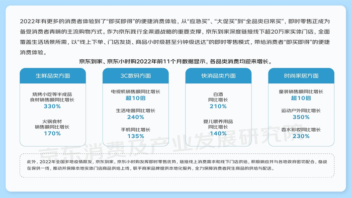 2022年有更多的消费者体验到了“即买即得”的便捷消费体验,从“应急买”、“大促买”到“全品类日常买”,即时零售正成为备受消费者青睐的主流购物方式。作为京东践行全渠道战略的重要支撑,京东到家深度链接线下超20万家实体门店,全面覆盖生活场景所需,以“线上下单、门店发货、商品小时级甚至分钟级送达”的即时零售模式,带给消费者“即买即得”的便捷消费体验。京东到家、京东小时购2022年前11个月数据显示,各品类消费均迎来增长。如生鲜品类方面,烧烤小吃等半成品食材销售额同比增长330%,火锅食材销售额同比增长170%;3C数码方面,电视机销售额同比增长超10倍,生活电器同比增长240%,手机同比增长135%;快消品类方面,白酒同比增长210%,婴儿喂养用品同比增长140%;时尚家居方面,童装销售额同比增长超10倍,运动户外同比增长350%,香水彩妆同比增长230%。