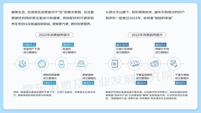 从西北天山脚下,到东南海岸线,遍布天南海北的农户和京东一起度过2022年,收获着“稳稳的幸福”,云南小粒咖啡成交额同比增长超230%,宁夏盐池滩羊、锡盟牛羊肉、宁德大黄鱼的成交额同比增长也都超过60%。随着农村地区基础设施不断完善,以及数字技术的助力,来自全国各地的高质量“地标农产品”让消费者的“餐桌”实现快速升级,让农民实实在在增收,“高质量农产品–消费升级–农民增收”的正循环正在加速运转。