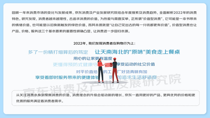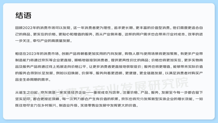 回顾2022年的消费市场可以发现,这一年消费者更为理性,追求更长期、更丰富的价值型消费。他们需要更适合自己的商品、更实在的价格、更贴心和增值的服务,而从产业侧来看,这样的用户需求也会带来行业对成本、效率的进一步关注,牵引产业的高质量发展。相信在2023年的消费市场,创新产品将朝着更加实用的方向发展,购物人群与使用场景将更加聚焦,有更多产业带制造能力将通过京东等企业更直接、顺畅地链接到消费者,提供更具性价比的商品;价格也将更加实在,更多实物商品及服务产品将通过线上拓展走向价格公平,让更多消费者更直接地获取低价;服务也将更增值,能够带来实际价值的服务会得到长足发展,例如以旧换新、价保等,服务向着更透明、更便捷、更全链路发展,以满足消费者对购买产品全生命周期的需求。