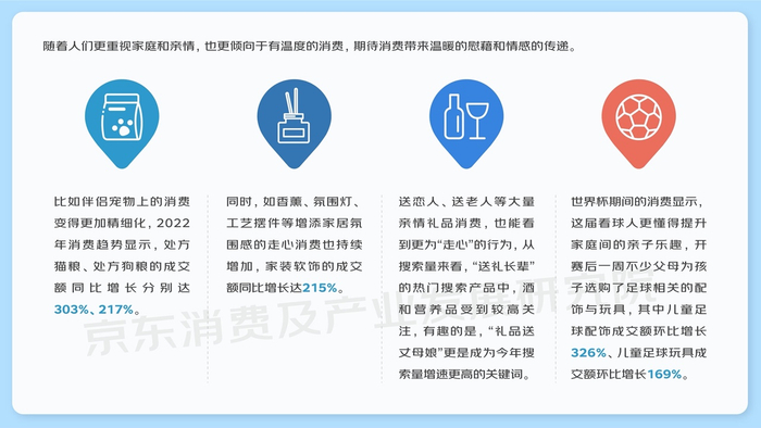 随着人们更重视家庭和亲情,也更倾向于有温度的消费,期待消费带来温暖的慰藉和情感的传递。比如伴侣宠物上的消费变得更加精细化,2022年消费趋势显示,处方猫粮、处方狗粮的成交额同比增长分别达303%、217%。同时,如香薰、氛围灯、工艺摆件等增添家居氛围感的走心消费也持续增加,家装软饰的成交额同比增长达215%。送恋人、送老人等大量亲情礼品消费,也能看到更为“走心”的行为,从搜索量来看,“送礼长辈”的热门搜索产品中,酒和营养品受到较高关注,有趣的是,“礼品送丈母娘”更是成为今年搜索量增速更高的关键词。世界杯期间的消费显示,这届看球人更懂得提升家庭间的亲子乐趣,开赛后一周不少父母为孩子选购了足球相关的配饰与玩具,其中儿童足球配饰成交额环比增长326%、儿童足球玩具成交额环比增长169%。