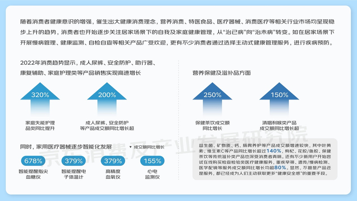 随着消费者健康意识的增强,催生出大健康消费理念,营养消费、特医食品、医疗器械、消费医疗等相关行业市场均呈现稳步上升的趋势,消费者也开始逐步关注居家场景下的自我及家庭健康管理,从“治已病”向“治未病”转变。如在居家场景下开展慢病管理、健康监测、自检自查等相关产品广受欢迎,更有不少消费者通过选择主动式健康管理服务,进行疾病预防。2022年消费趋势显示,成人尿裤、安全防护、助行器、康复辅助、家庭护理类等产品销售实现高速增长,家庭失能护理品类同比提升320%,其中成人尿裤、安全防护等产品成交额同比增长超200%。同时,家用医疗器械逐步智能化发展,其中智能提醒指尖血糖仪成交额同比增长678%,智能提醒电子体温计同比增长379%,高精度血氧仪、心电监测仪同比379%和155%。