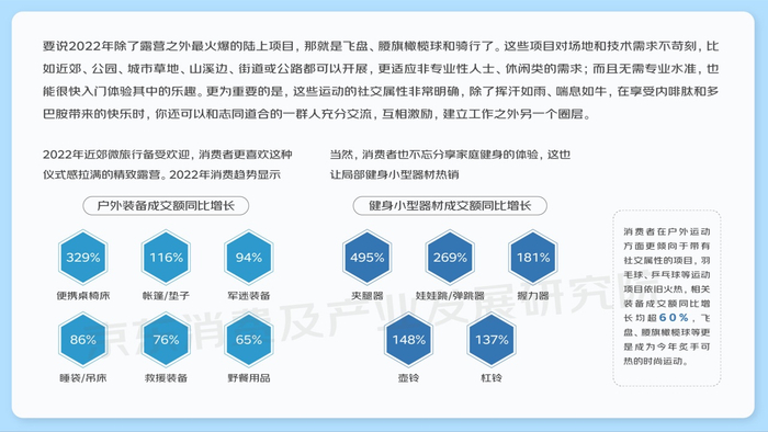 2022年近郊微旅行备受欢迎,消费者更喜欢这种仪式感拉满的精致露营。2022年消费趋势显示,户外装备中便携桌椅床、帐篷/垫子、军迷装备、睡袋/吊床、救援装备、野餐用品的成交额同比增长分别达329%、116%、94%、86%、76%、65%。消费者在户外运动方面更倾向于带有社交属性的项目,羽毛球、乒乓球等运动项目依旧火热,相关装备成交额同比增长均超60%,飞盘、腰旗橄榄球等更是成为今年炙手可热的时尚运动。当然,消费者也不忘分享家庭健身的体验,这也让局部健身小型器材热销,夹腿器、娃娃跳/弹跳器、握力器、壶铃、杠铃的成交额同比增长分别达495%、269%、181%、148%、137%。