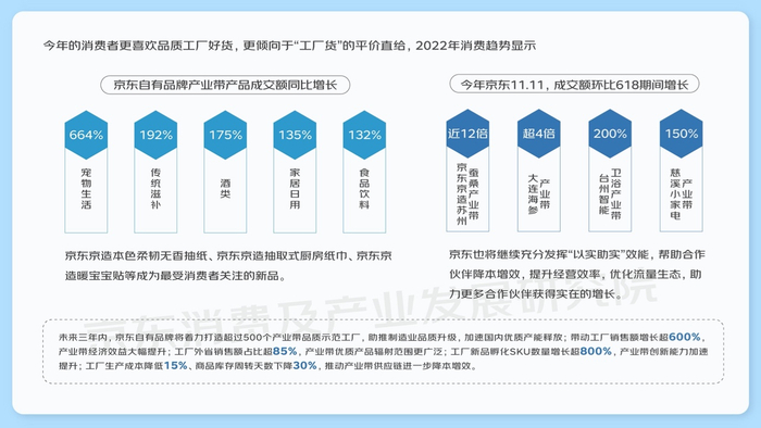 今年的消费者更喜欢品质工厂好货,更倾向于“工厂货”的平价直给,2022年消费趋势显示,京东京造宠物生活、传统滋补、酒类、家居日用、食品饮料类等产业带产品的成交额分别实现664%、192%、175%、135%、132%的高增长。京东京造本色柔韧无香抽纸、京东京造抽取式厨房纸巾、京东京造暖宝宝贴等成为最受消费者关注的新品。今年京东11.11,京东京造苏州蚕桑产业带成交额环比618期间增长近12倍;大连海参产业带成交额环比增长超4倍;台州智能卫浴产业带成交额环比增长近200%;慈溪小家电产业带成交额环比增长约150%。京东也将继续充分发挥“以实助实”效能,帮助合作伙伴降本增效,提升经营效率,优化流量生态,助力更多合作伙伴获得实在的增长。