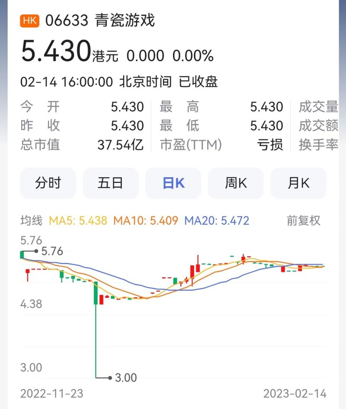 截至2月14日收盘,该股股价已跌至5.43港元/股,市值为37亿港元左右。