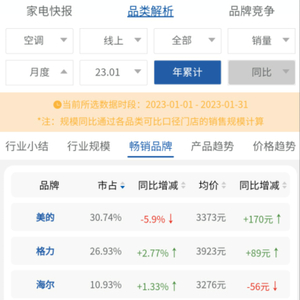 整体来看,由于1月并非空调销售旺季,各大空调品牌正在酝酿新冷年的产品、渠道、价格打法,为即将到来的销售旺季蓄力,因此整体市场低迷并不意外。但空调行业品牌格局的新变化还是值得关注: