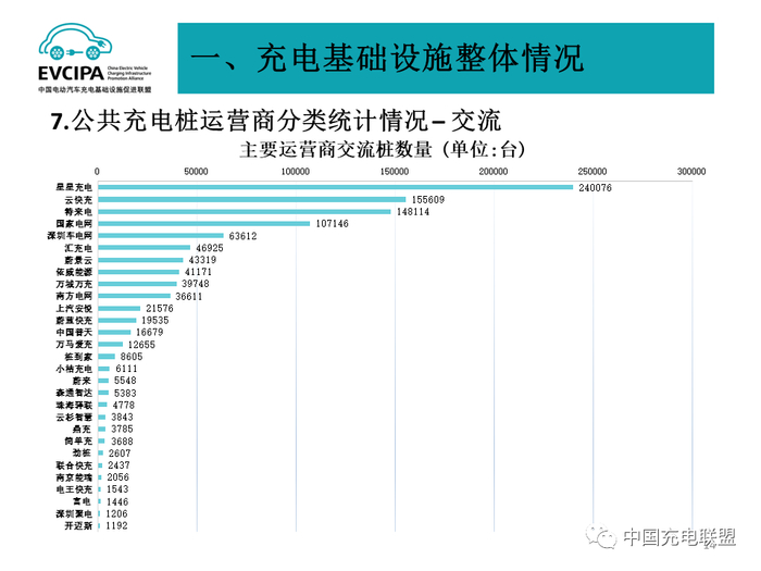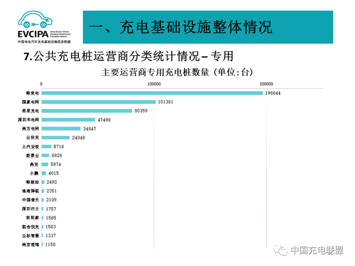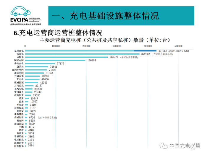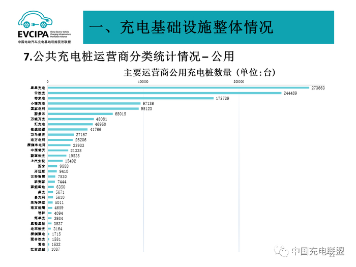 3、公共充电基础设施运营商运行情况,截止到2023年1月,全国充电运营企业所运营充电桩数量TOP15,分别为:特来电运营37.0万台、星星充电运营35.4万台、云快充运营26.9万台、国家电网运营19.6万台、小桔充电运营9.7万台、蔚景云运营7.5万台、深圳车电网运营7.1万台、南方电网运营6.1万台、万城万充运营4.8万台、汇充电运营4.7万台、依威能源运营4.2万台、万马爱充运营2.7万台、上汽安悦运营2.4万台、中国普天运营2.3万台、蔚蓝快充运营2.0万台。这15家运营商占总量的93.9%,其余的运营商占总量的6.1%。